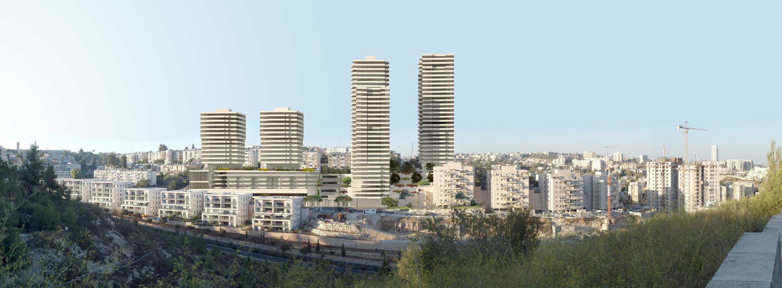 Developed through a partnership between the Jerusalem Municipality and a private developer, the plan enables “construction first” to allow residents to relocate to the new towers before demolition. It integrates public functions including kindergartens, a synagogue, a community center, and dormitories, with 1,486 m² allocated for public needs, 2,427 m² for public housing, and 1,770 m² of private open space.